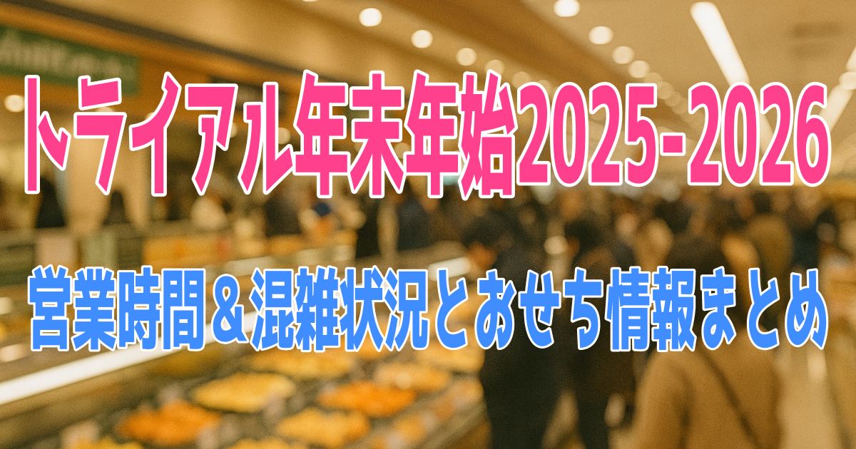「年末は何時まで営業してるの?」「元日は開いてる?」――そんな疑問に応えるべく、この記事では、トライアルの年末年始2025-2026の営業時間の見方と、混みやすいタイミングの目安をまとめますね。最後に、予約系のごちそうやおせちの情報も整理します。